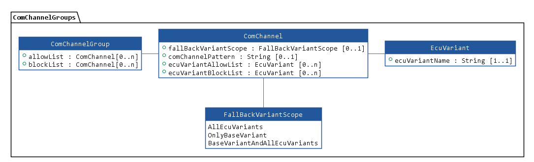 Furthermore a ComChannel can have a comChannelPattern or a ecuVariantAllowList and/or ecuVariantBlockList. The ecuVariantAllowList and ecuVariantBlockList have an mandatory ecuVariantName.
