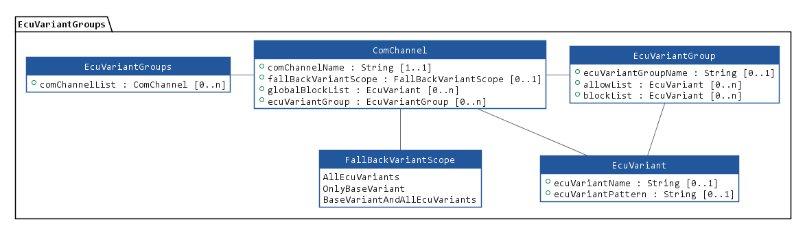 The fallbackVariantScope defines, which kind of variants should be considered for the validation. AllEcuVariants is the default value and means that the base variant will will not be considered. OnlyBaseVariant means the only the BaseVaraion will be considered and BaseVariantAndAllEcuVariants means that all variants and also the BaseVariant will be considered. Furthermore a ComChannel can have a globalBlockList and/or a ecuVariantGroup. The ecuVariantGroup has a mandatory name which identifies the ecuVariantGroup and an allowList and / or blockList. The globalBlockList, allowList and blockList contains the EcuVariants. An EcuVariant will be specified by an ecuVariantName or an ecuVariantPattern.