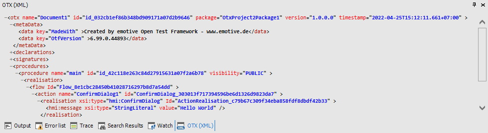 The OTX (XML) tool window allows users to view the underlying OTX (XML) code of a procedure or an activity in the Workflow Designer. In the tool window, the XML codes of an OTX procedure/node is displayed in the hierarchy structure. Through these codes, you can get the data which are not displayed in the designer such as the id of a procedure ect. Sometimes, you can not know exactly the reason for the errors and warnings in the Error List, these codes may help you to find out the reason.