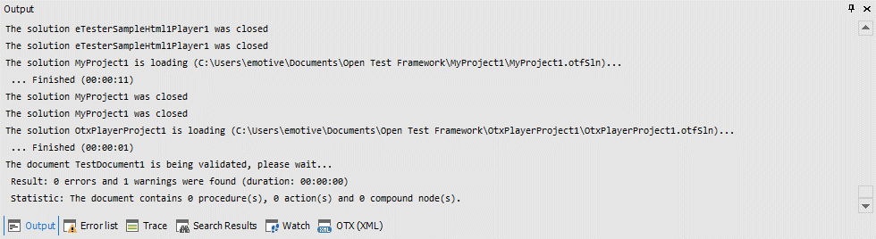 The Output window displays important status messages of the operations in the OTF, as well as the log messages from the runtime. With the Output window, you can monitor the changes in the OTF at design time and run time. The Output window monitoring can be turned off to improve the OTX-runtime performance via the ON/OFF button. You can also determine to display the log messages in the window or not via the Inclusive Log-Outputs button. Besides, you can use the Clear button to clear all the existing messages for a new working session e.g. a new start or build. In case you do not want to to clear the old messages manually, you can use the Delete automatically button which enables the Output window to automatically clear the old messages each time a project/solution is built.