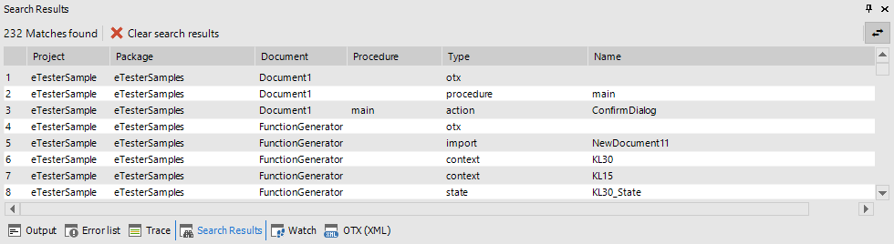 The gridview displays all the matched results in rows and columns, each row for each result and each column for a category of the result data. There are the following columns: "Project", "Package", "Document", "Procedure", "Type", "Name". You can click on the header of a column to sort all the results according to the A-Z (or Z-A) order of the values in that column. You can also easily find the location of a matched result by double-clicking on the result row, it will focus the related element (it will also automatically open tab or expand node if necessary).