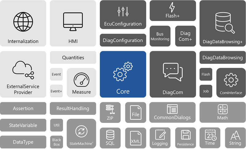 OTX consists of a stand-alone executable Core. Inside the Core the entire data model for a complete programming language is defined as well as all extension interfaces, which new OTX Extensions can implement. Each OTX Extension extents the Core by new domain specific functionality. At first for the vehicle diagnostics domain, also for the communication between different external systems and for other functionality, which is necessary for a complete language, like file access, logging, string handling, date time handling and so on.