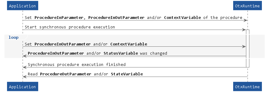 A Procedure can be executed in two similar modes: synchronously or asynchronously, see Execute or ExecuteAsync. Synchronously means that the thread where the procedure is executed will be stopped until the procedure execution will finished. Asynchronously means that the thread where the procedure is executed will not be stopped during the procedure execution. In this case, the application must handle the procedure events like ProcedureFinished, see RuntimeManager.