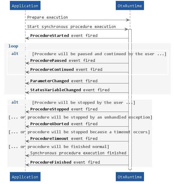 The following sequence diagram shows the possible events while procedure execution. The events will be handled inside the RuntimeManager.
